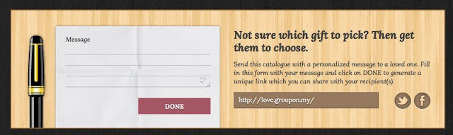 Just scroll till the end of the website from Groupon Malaysia Season of Love page here to write down your message at the message box and click done when your finished. A link will be generated at the mini link bar at the side in brown colour something like this link (http://love.groupon.my/letters/1l3ezd).Simple enough? You can also share your message to tag that special someone via Twitter or Facebook by clicking on the icons!A great idea if your not sure what to give that special someone, this digital love letter to helps you to share and express your feelings!