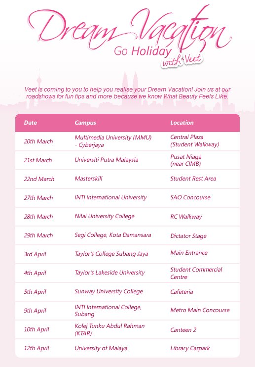 Pretty exciting, isn’t it? Well, if your a student of any of the colleges or universities mark your calendars and look out for Veet Roadshow!