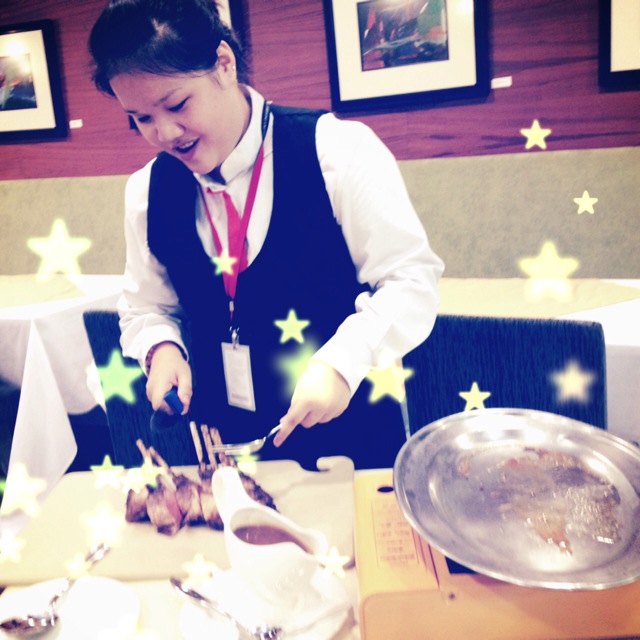 Tasha preparing our Roasted Lamb Racks with on the spot presentation.