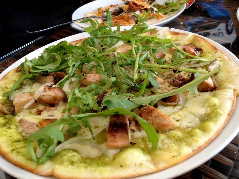 Delicious chicken topped with rocket leaves, onions homemade pesto sauce and olive oil.
