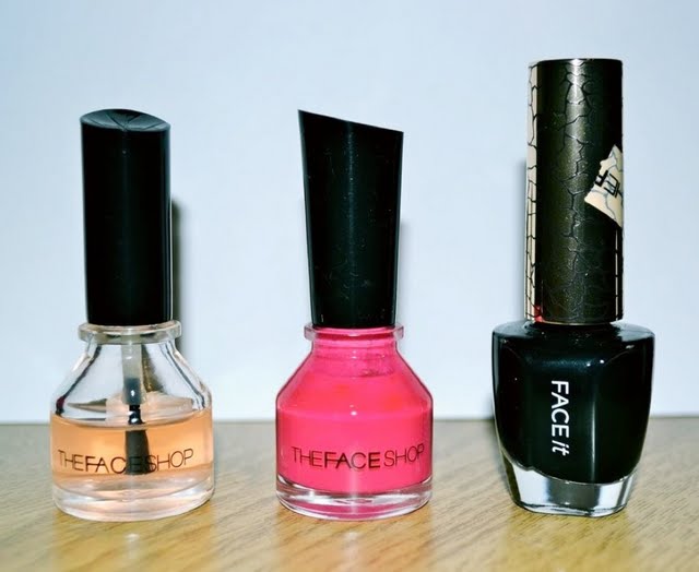 What you need is a base coat, a colour nail polish (prefeberly bright colours) and a black crack nail polish. I’m using all the products from The Face Shop here.