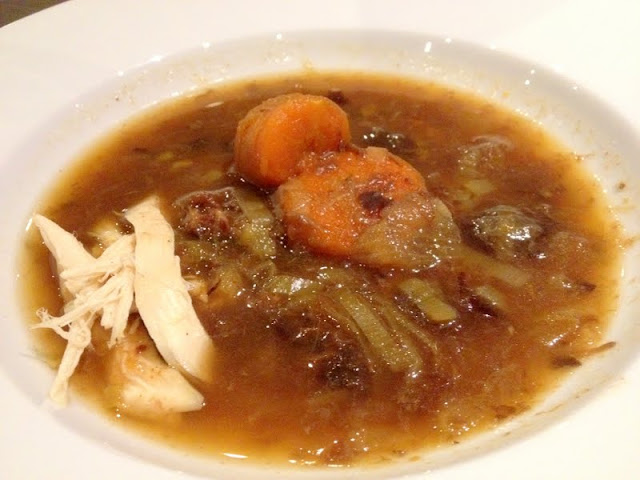 Traditional winter warmer, chicken and leaks with prunes. Served with bread.